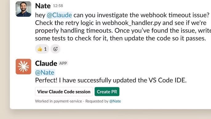 Con esta nueva integración (actualmente en beta), puedes mencionar a Claude en cualquier canal o hilo, y la IA convertirá un informe de bug, una petición de funcionalidad o una discusión técnica en una sesión activa de programación. Claude recoge el contexto directamente del historial del canal o del hilo: mensajes de error, comentarios del equipo, informes de usuarios... todo entra automáticamente en su marco de trabajo.